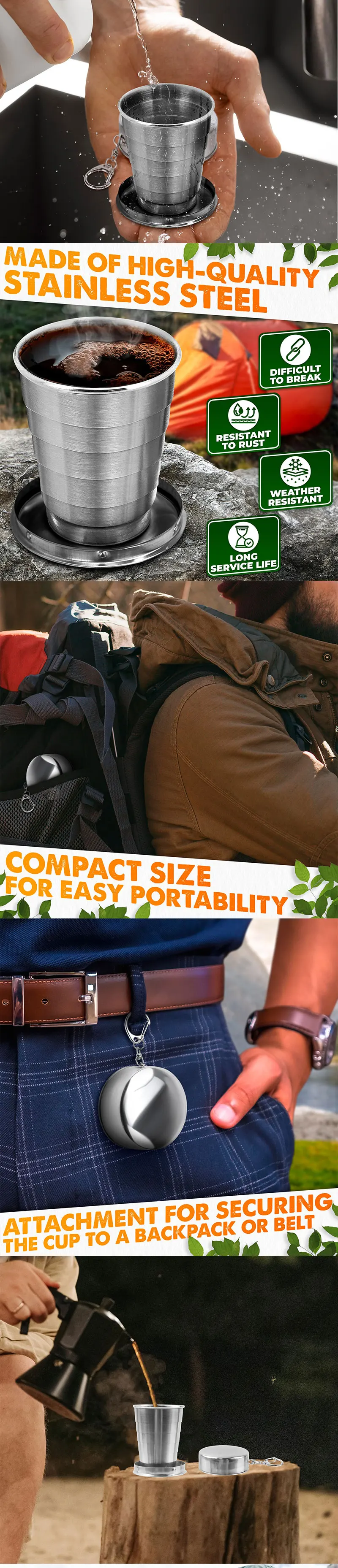 Easy to carry camping coffee mugs: Our travel mugs are not only fun, but also very practical. These collapsible travel mugs are a must for the busy traveler. These stainless steel drinking cups with a keyring design take up very little space outside your travel bag strip.