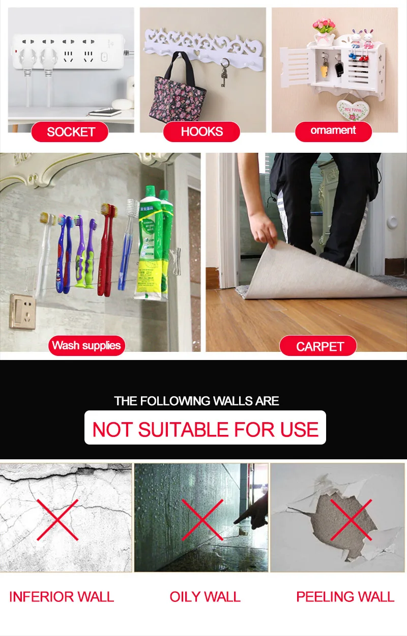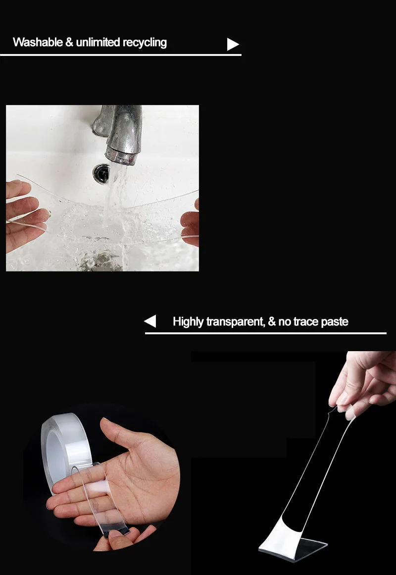 【REMOVABLE & REUSABLE & TRACELESS】:The removable double-sided tape is made of nano PU gel material.It leaves no residue, easy to remove and will not damage the surface of the item.Wash it with water and dry it to regain its stickiness when you need to reuse the tape.
