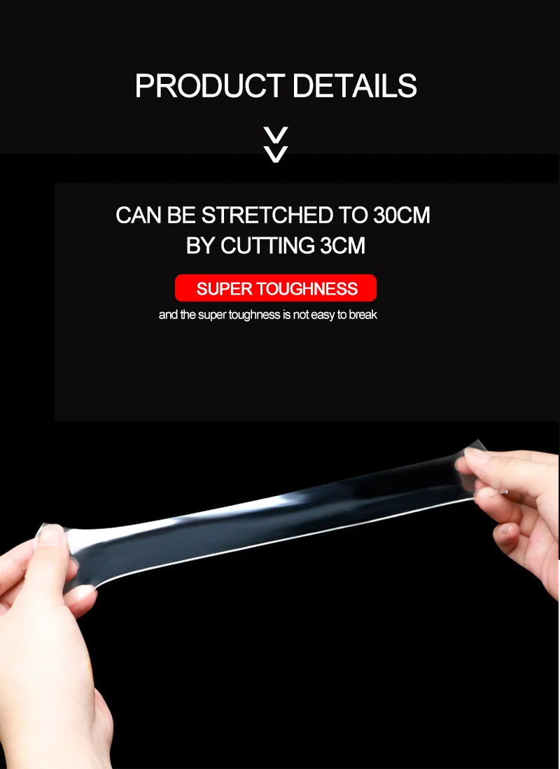 The double sided tape can stick to almost any smooth, clean and non-porous surface. It can be stretched, bending and folded out of shape, you can DIY this transparent adhesive tape to any size and length to meet your needs!