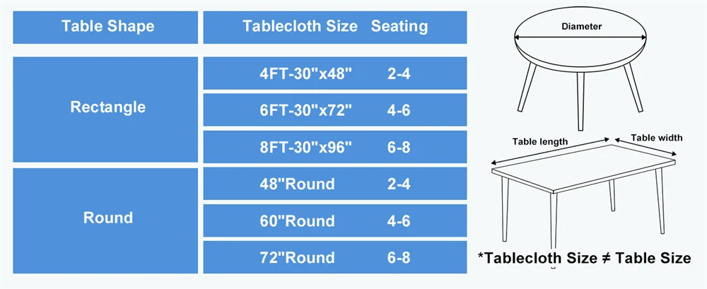 Olanly tablecloth covers are suitable for rectangular tables that are 72 inches long, 30 inches wide and less than 1.57 inches thick. Please measure your table carefully before buying.