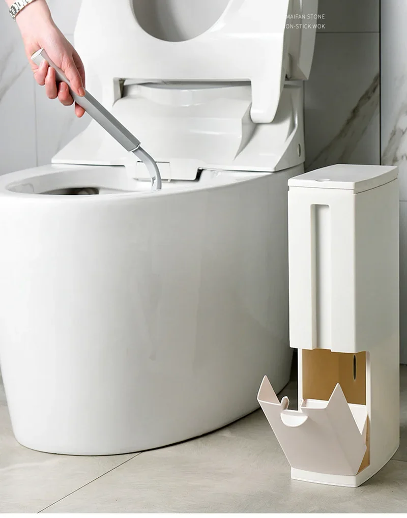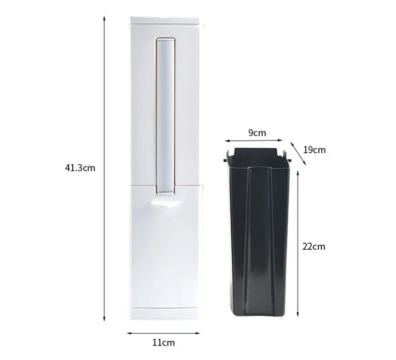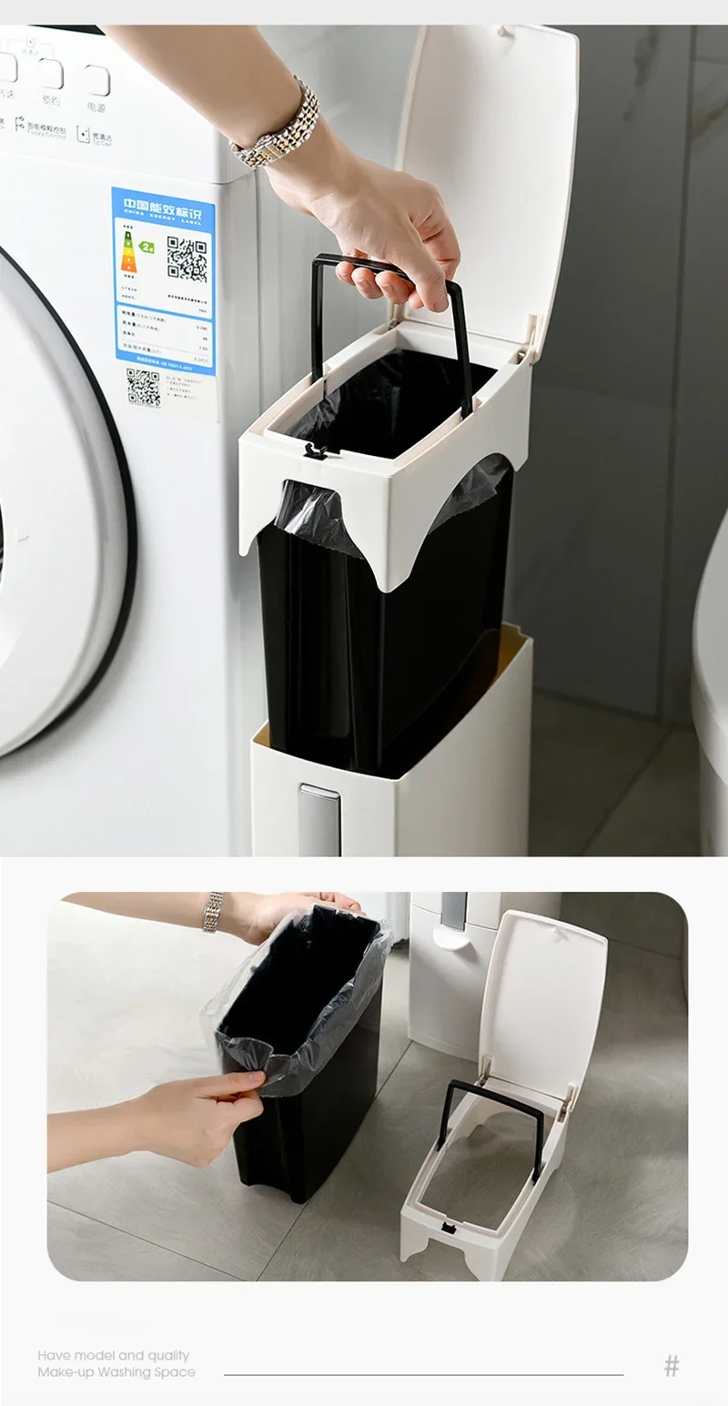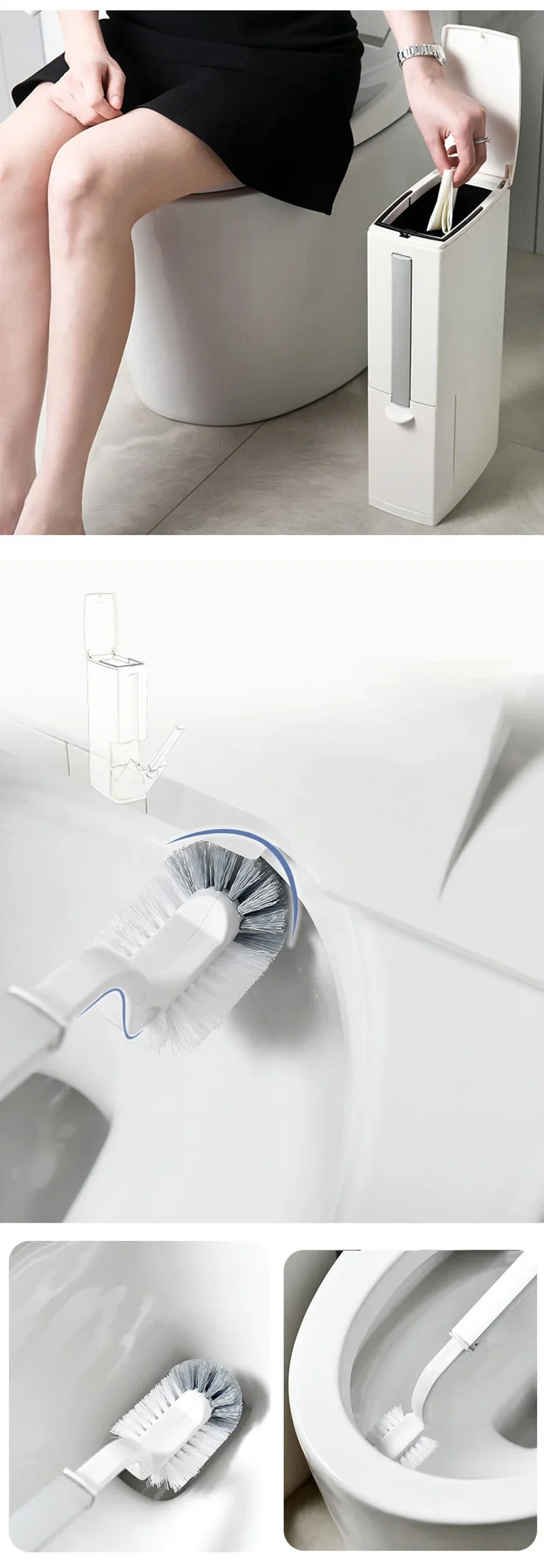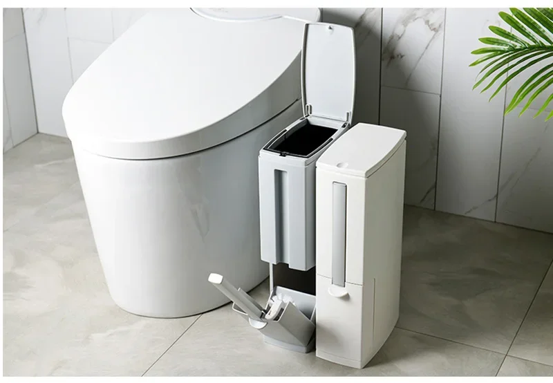 1.With toilet brush: trash can + toilet brush 2 in 1 set, toilet brush can be folded and hidden in the bucket, saving storage space 2.Double-layer bucket with handle: The double-layer bucket is tightly closed, which effectively prevents the emission of odors and is easy to handle. 3.Narrow Style slit storage:Reasonable use of small spaces, free placement without occupying space