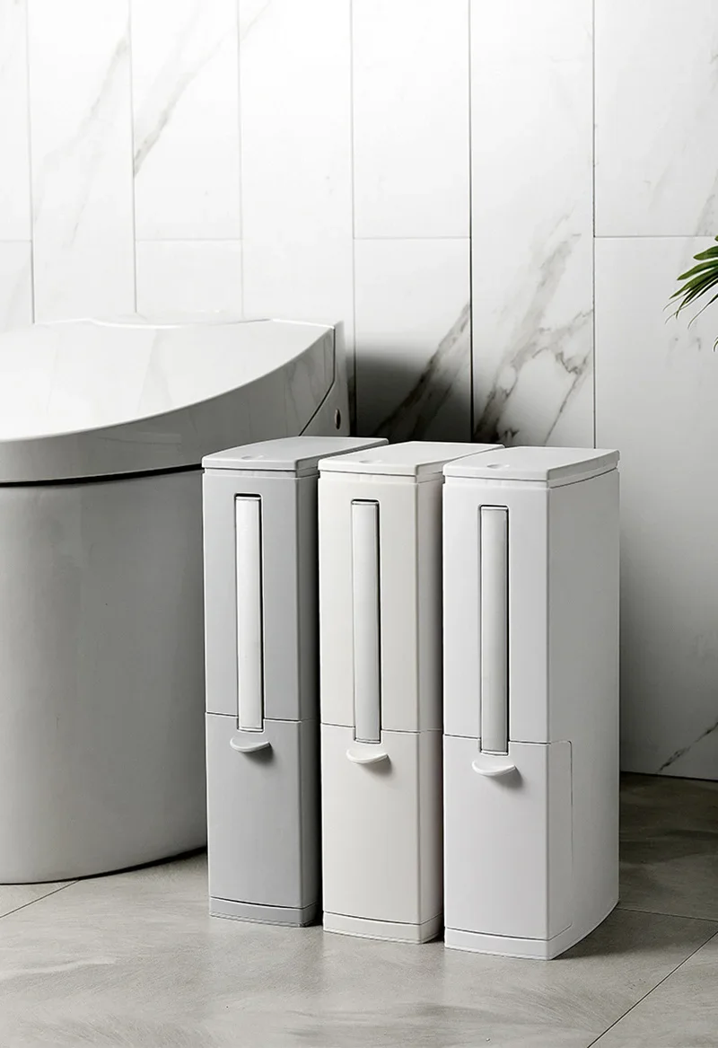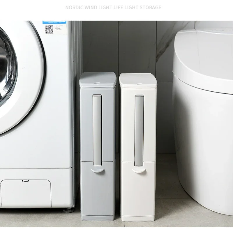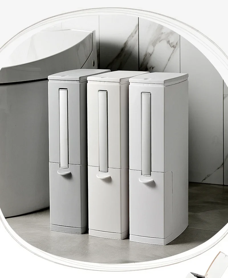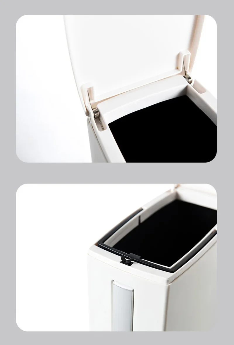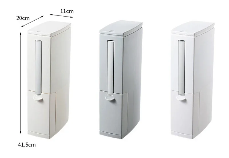 1.With toilet brush: trash can + toilet brush 2 in 1 set, toilet brush can be folded and hidden in the bucket, saving storage space 2.Double-layer bucket with handle: The double-layer bucket is tightly closed, which effectively prevents the emission of odors and is easy to handle. 3.Narrow Style slit storage:Reasonable use of small spaces, free placement without occupying space