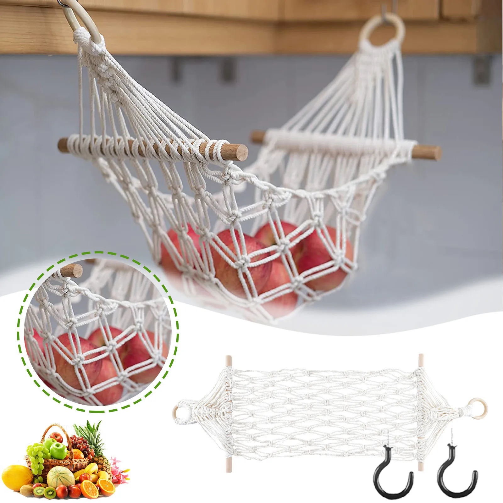 Premium Woven Hanging Fruit Basket for Kitchen – Space-Saving Cotton Net with Hooks
